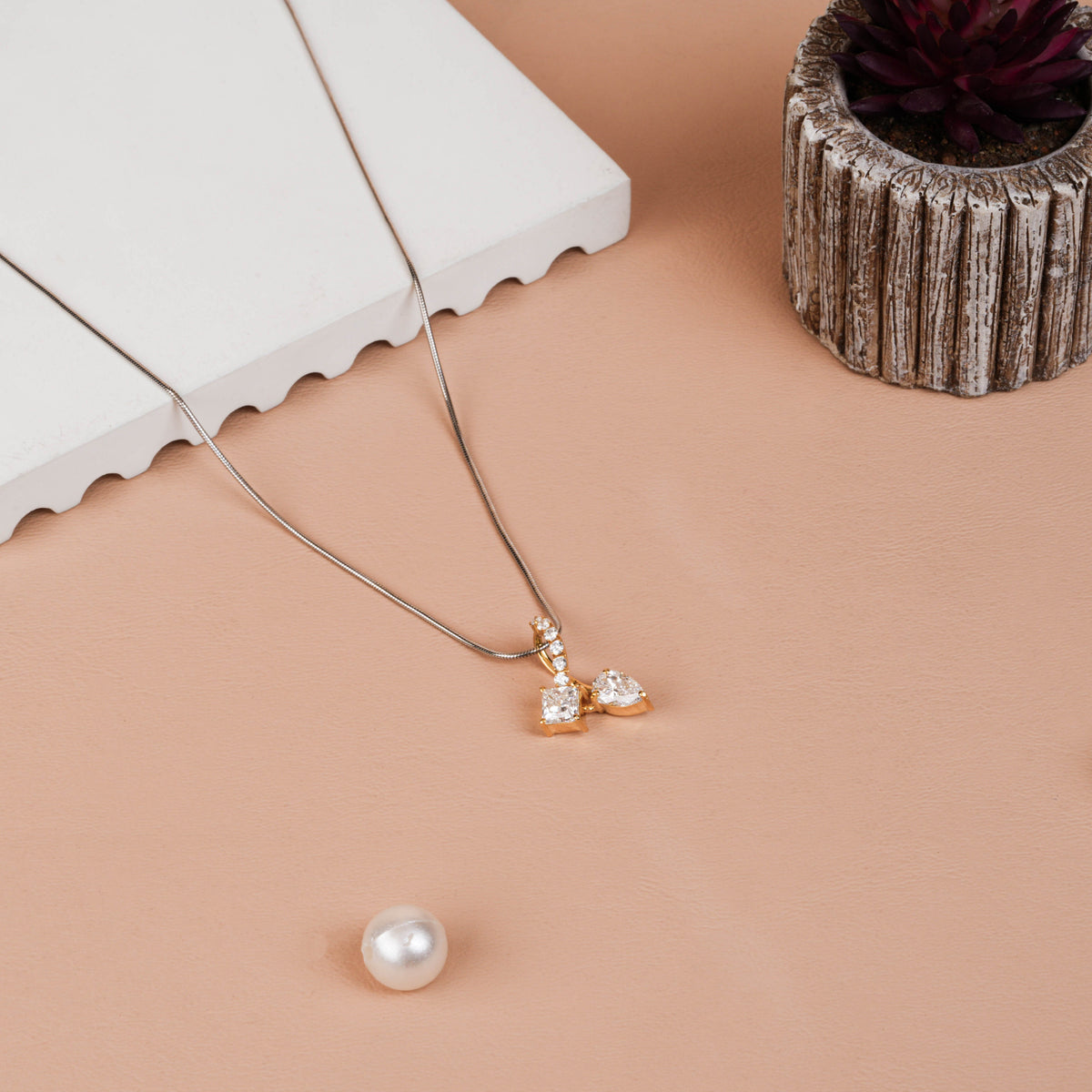 This modern Geometric Drop Pendant beautifully blends a sparkling Princess cut lab diamond with an elegant Pear cut drop, connected by a sleek curve of shimmering Round diamonds. Its unique shape and radiant symmetry make it a standout accessory for any look. Perfect as a thoughtful gift, a chic wedding piece, or a memorable anniversary surprise.